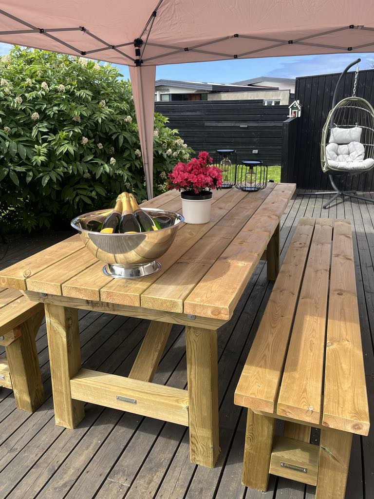 Einsog öll okkar útiborð eru þau smíðuð úr þykkum gagnvörðum plönkum og sett saman með ryðfríum skrúfum og heitgalvaniseruðum borðaboltum.